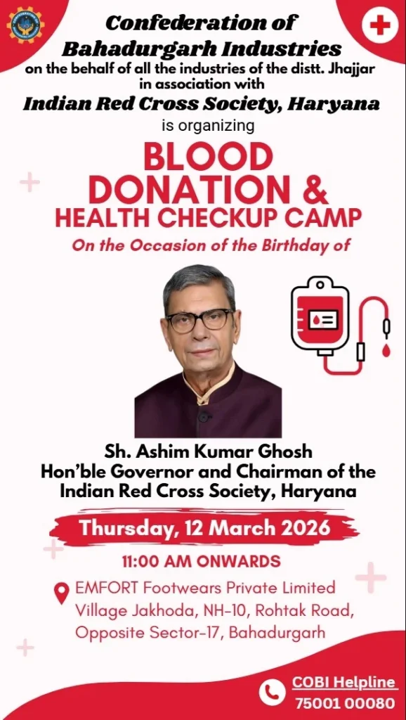भारतीय रेड क्रॉस सोसाइटी, हरियाणा की CSR Committee के सदस्य के रूप में Confederation of Bahadurgarh Industries ने झज्जर जिले के सभी उद्योगों का नेतृत्व करते हुए एक Blood Donation Camp एवं स्वास्थ्य जांच शिविर का आयोजन किया जा रहा है।