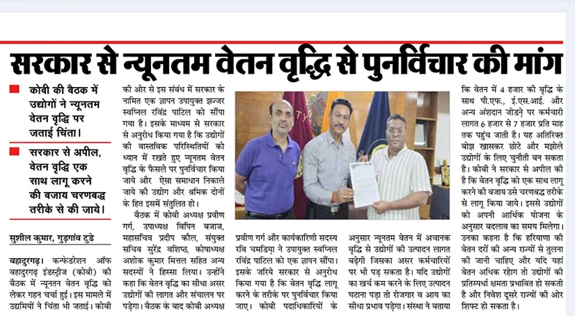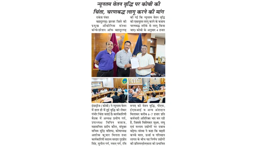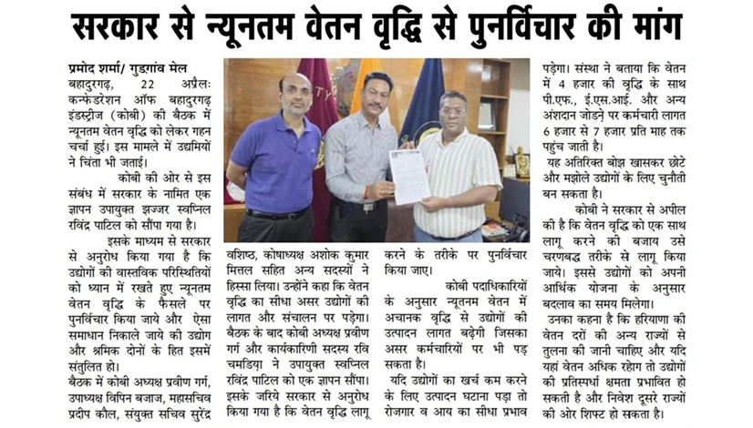 कॉन्फेडरेशन ऑफ बहादुरगढ़ इंडस्ट्रीज (कोबी) ने न्यूनतम वेतन में हाल ही में हुई वृद्धि पर अपनी चिंता व्यक्त करते हुए सरकार से इस निर्णय पर पुनर्विचार करने की मांग की है। संस्था का कहना है कि अचानक हुई वेतन वृद्धि से विशेषकर छोटे और मध्यम उद्योगों पर आर्थिक दबाव बढ़ सकता है, जिससे उत्पादन लागत और रोजगार दोनों प्रभावित हो सकते हैं। कोबी ने सुझाव दिया है कि इस वृद्धि को चरणबद्ध तरीके से लागू किया जाए ताकि उद्योगों और कर्मचारियों के बीच संतुलन बना रहे।