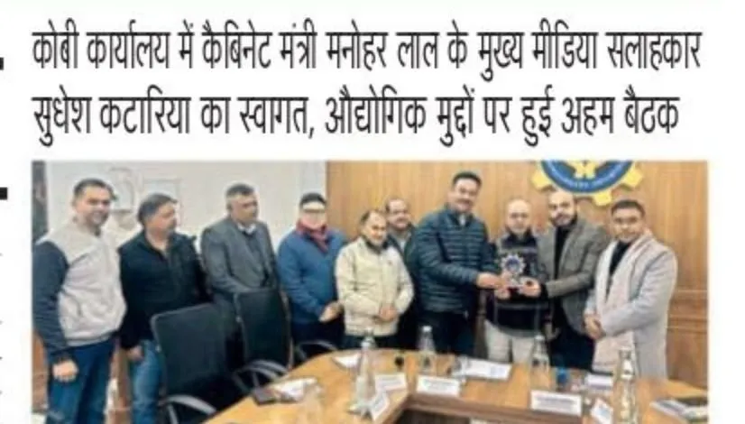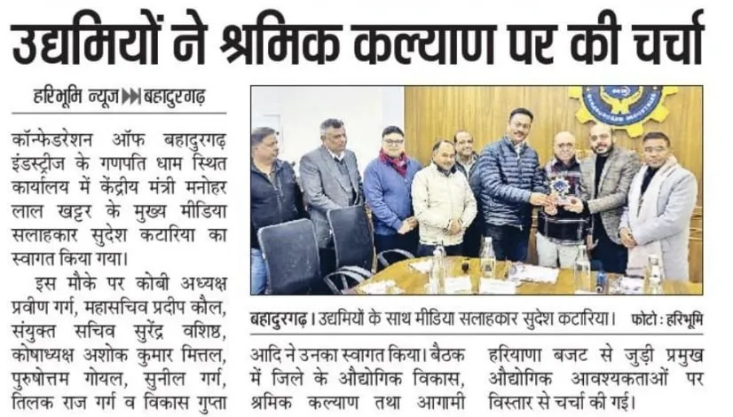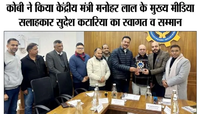 इज्जर जिले के उद्योगों का प्रतिनिधित्व करने वाली अग्रणी औद्योगिक संस्था कन्फेडरेशन ऑफ बहादुरगढ़ इंडस्ट्रीज (कोबी) द्वारा भारत सरकार के कैबिनेट मंत्री मनौहर लाल के मुख्य मीडिया सलाहकार सुदेश कटारिया का गर्मजोशी से स्वागत एवं सम्मान किया गया। यह कार्यक्रम कोबी कार्यालय में आयोजित किया गया, जहाँ उद्योग जगत से जुड़े प्रतिनिधियों की उपस्थिति में एक महत्वपूर्ण बैठक भी हुई।