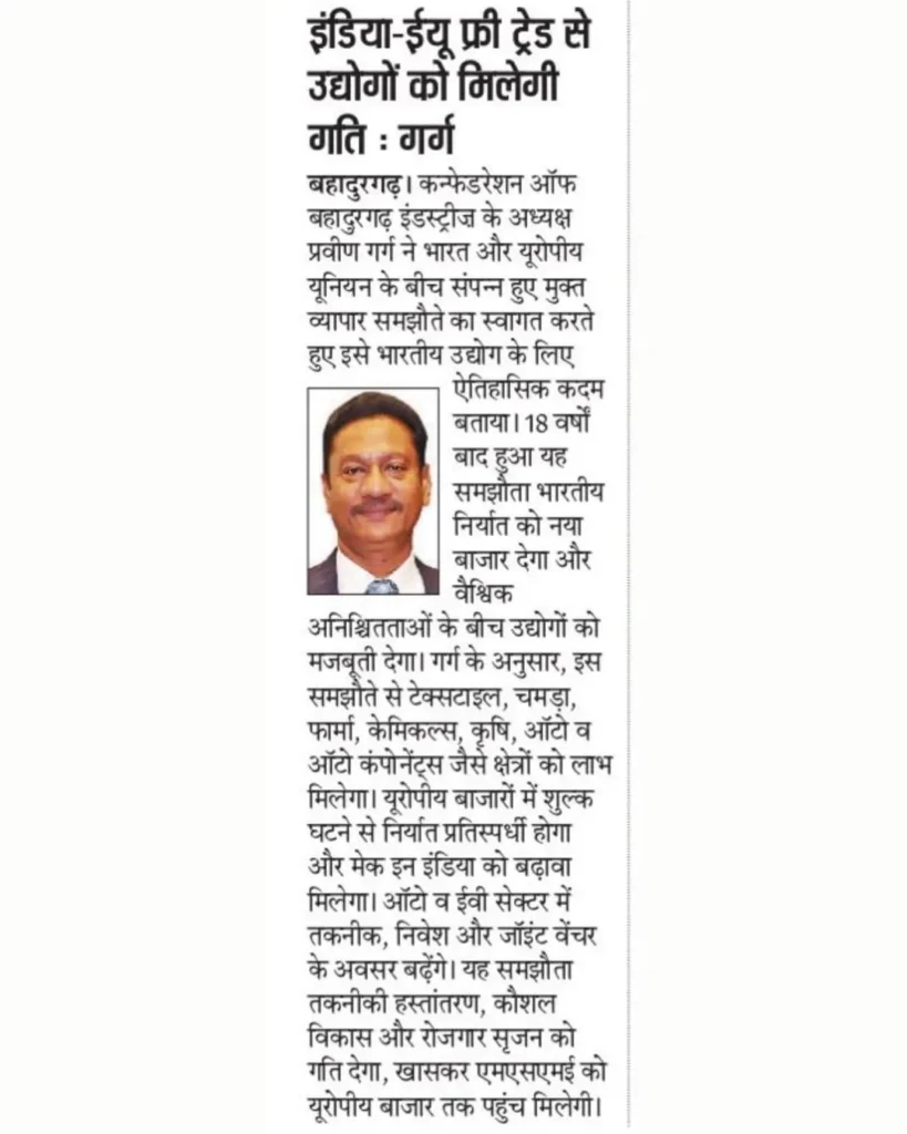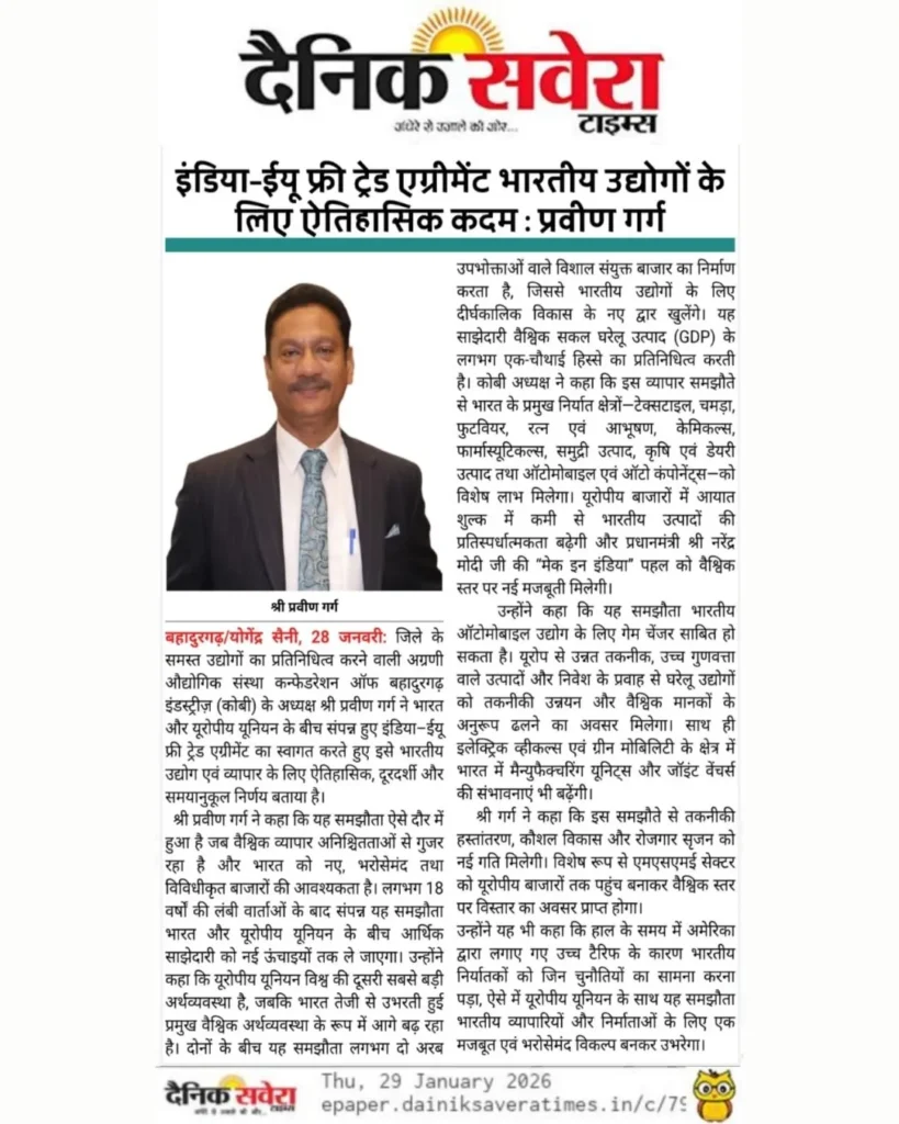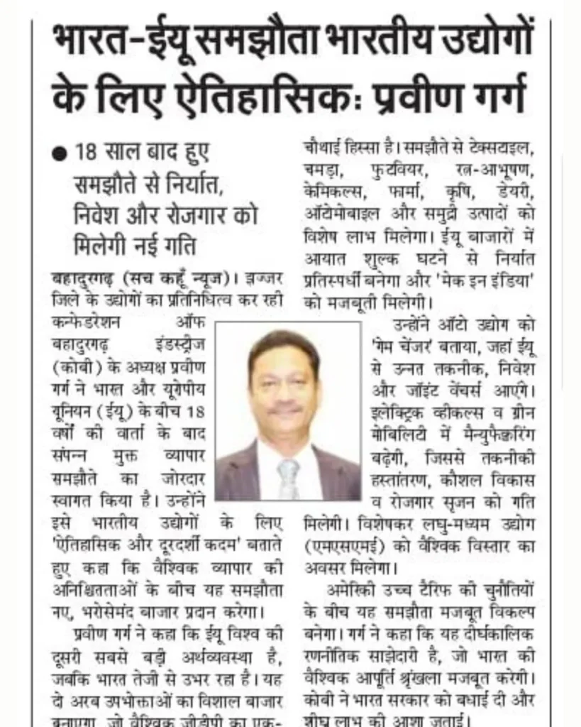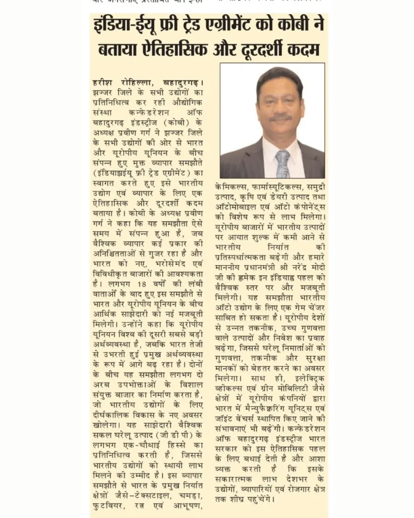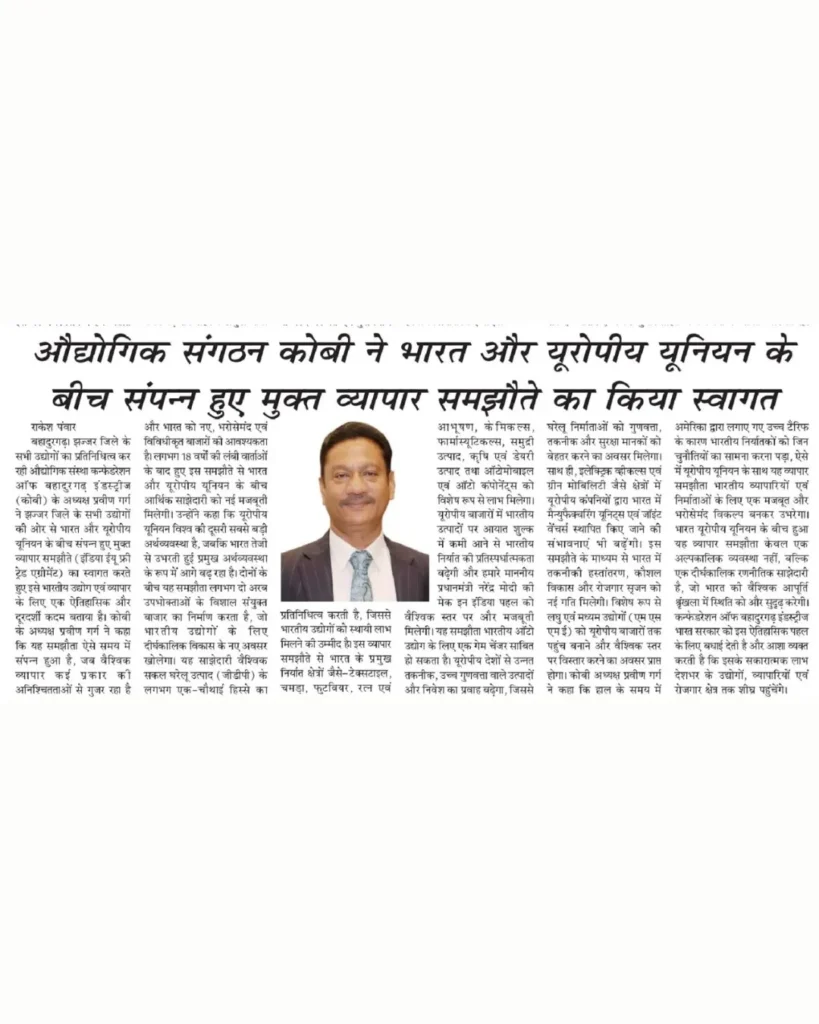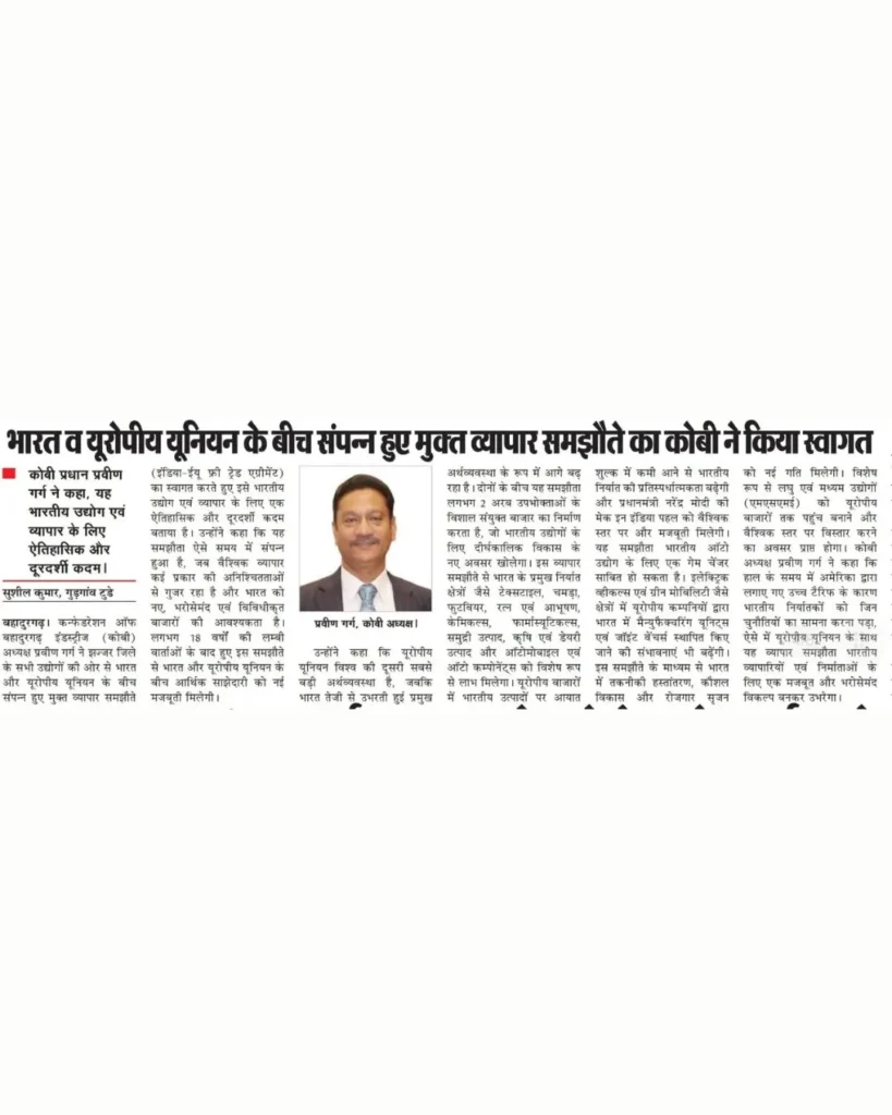 इंडिया-ईयू फ्री ट्रेड एग्रीमेंट को कोबी ने बताया ऐतिहासिक और दूरदर्शी कदम I