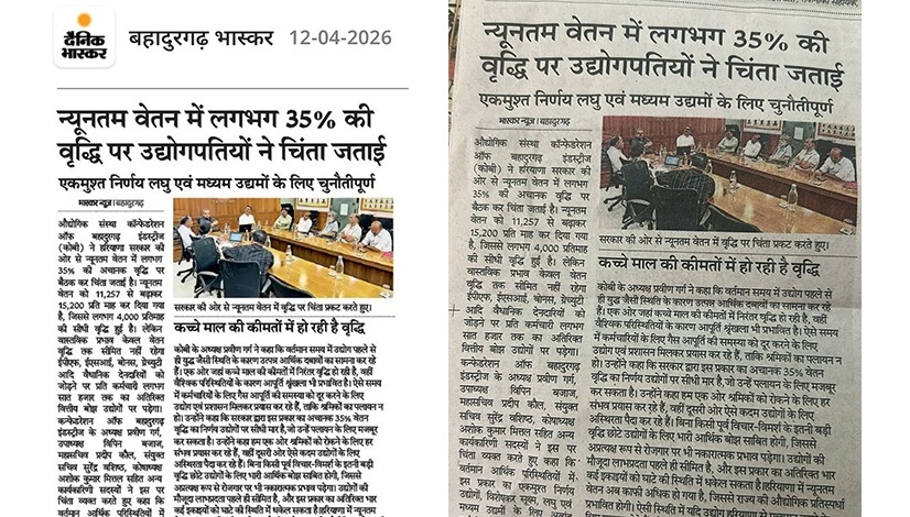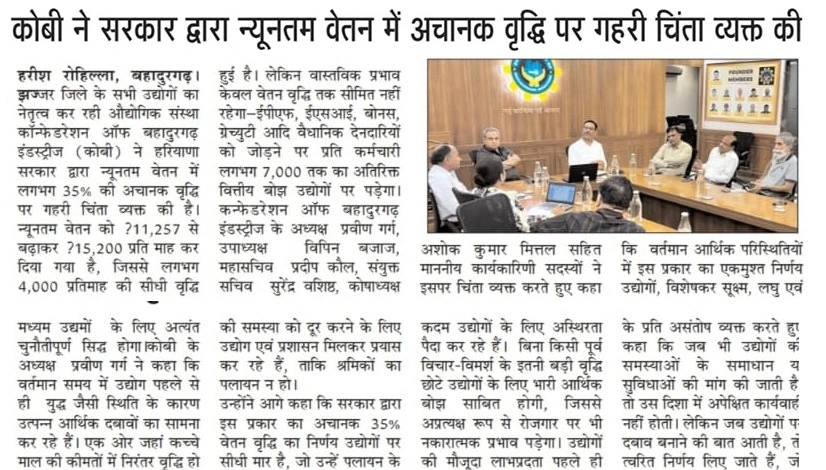 हरियाणा सरकार द्वारा न्यूनतम वेतन में लगभग 35% की अचानक वृद्धि को लेकर उद्योगपतियों ने गहरी चिंता व्यक्त की है। वेतन को ₹11,257 से बढ़ाकर ₹15,200 प्रति माह किए जाने से लघु एवं मध्यम उद्योगों पर आर्थिक दबाव काफी बढ़ने की आशंका है। कॉन्फेडरेशन ऑफ बहादुरगढ़ इंडस्ट्रीज (कोबी) के अनुसार, पहले से ही कच्चे माल की बढ़ती कीमतों और अन्य खर्चों से जूझ रहे उद्योगों के लिए यह निर्णय चुनौतीपूर्ण साबित हो सकता है। इससे उत्पादन लागत बढ़ेगी, रोजगार पर असर पड़ सकता है और क्षेत्र की औद्योगिक प्रतिस्पर्धा भी प्रभावित हो सकती है।