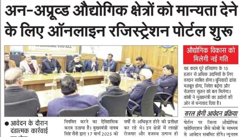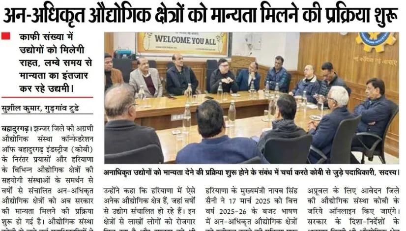 झज्जर जिले की अग्रणी औद्योगिक संस्था कॉर्डिनेशन ऑफ़ बहादुरगढ़ इंडस्ट्रीज (कोबी) के निरंतर प्रयासों और हरियाणा के विभिन्न औद्योगिक क्षेत्रों की सहयोगी संस्थाओं के समर्थन से वर्षों से संचालित अन-अधिकृत औद्योगिक क्षेत्रों को अब सरकार की मान्यता मिलने की प्रक्रिया शुरू हो गई है।
